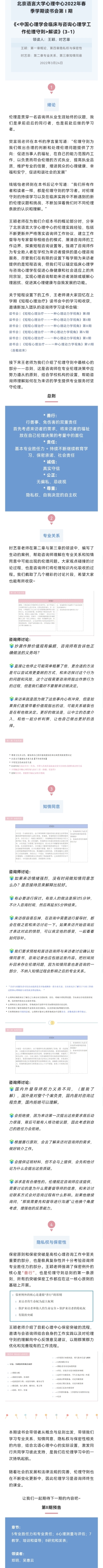 北京语言大学心理中心2022年春季学期读书会书目包括《< 中国心理学会临床与咨询心理学工作伦理守则>解读》与《动机式访谈手册》,在推荐与选书的过程中将伦理学习与专业胜任力提升结合起来。欢迎关注读书会分享,与我们一道学习。