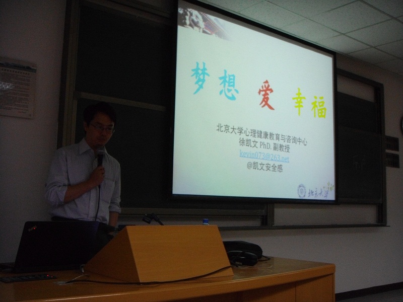 2012年5月31日晚7:00,北京大学学生心理健康教育与咨询中心博士徐凯文老师做客北语,为同学们带来一场关于“梦想,爱与幸福”的心理学讲座。本次讲座既是一次关于心理健康知识的传递,同时又为今年北语的5.25大学生心理健康节画上了一个圆满的句号。