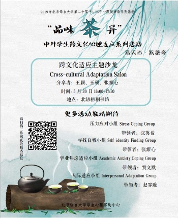 活动的第一场是跨文化适应主题沙龙(Cross-cultural Adaptation Salon),将于5月30日16:00-17:30在北语梧桐书坊的茶室举办。参与者不仅能和分享们一起品茶,还能面对面交流跨文化交际中常出现的问题,学习如何应对跨文化交际中的差异。