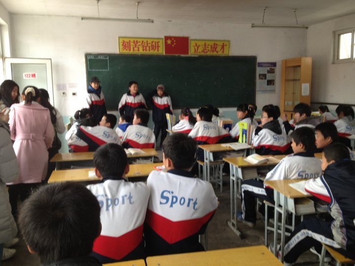 2:00左右的时候,我们开始分两组分别进入四个班。这是第二次集体接触,年轻的面孔,拘谨的眼神,话不多,但活力四射。后排的孩子们已经站起来腾出凳子给我们坐。而在接下来的破冰游戏,“大火炬手”自我介绍和代表发言后,气氛一点点活跃起来。几位大火炬手发表了演说,鼓励孩子们树立理想,克服困难,努力奋斗,接着让他们在卡片上写下自己的理想和愿望。看着孩子们小心翼翼又极为认真地在卡片上书写,我们知道,信念的种子正在他们心里生根、发芽。我们大火炬也写下了很多祝福贴在墙上,但对于孩子们来说,墙上的那些贴纸,已不再是一个渴望,一个憧憬,而是追求和动力。随着活动的深入,我们逐渐走入了孩子们的内心,而他们也对我们产生了依恋的情绪。