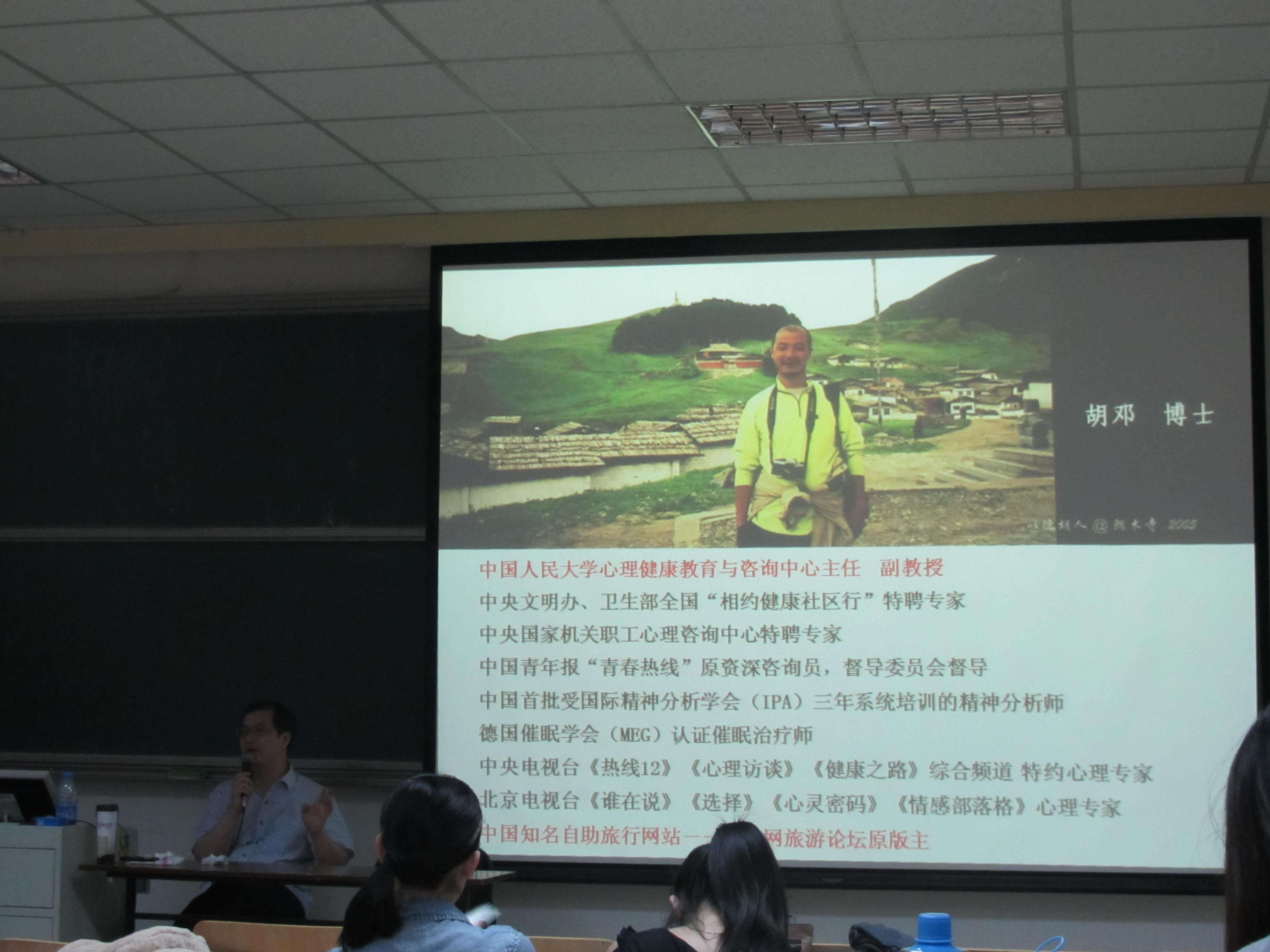 2013年5月22日晚7时,由心理协会举办的讲座“旅行成就梦想”请到了中国人民大学的胡邓老师做了一场关于旅行的心灵讲座。胡老师轻松幽默的话语,匪夷所思的经历,从旅游梦想中对人生的通透的理解。不仅赢得了在场同学的积极听讲参与,也让我们在讲座之后,心中风气波澜,对人生和梦想有了新的思索。我们枯萎的心重新获得来自生命本身的力量,我们还年轻,梦想还在路上。