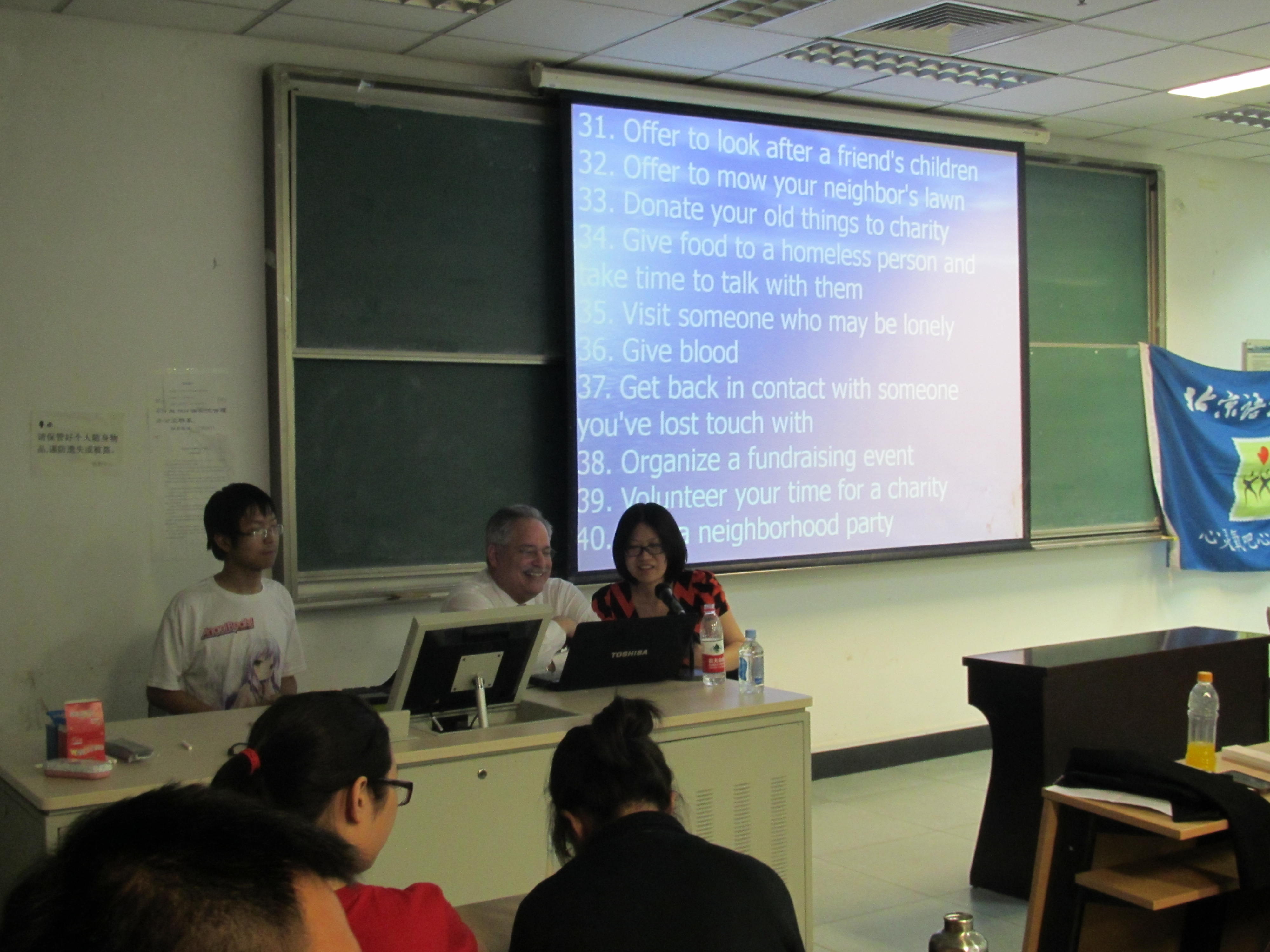 讲座中,Portnoy博士针对忙碌心态还是平静心态的选择、乐观心态对于快乐的影响等问题做了详尽阐释。例如,对于“批评”这一行为在人际关系中对幸福指数的影响。Portnoy博士解释道:“批评”是一种自动的但是危险的回答反映,以及,我们应将非批评意见和批评性话语的比例维持在5:1。而其中Portnoy博士用数据图示展示了一些具体现象更是帮助了我们理解。如,“离婚次数与不幸福指数”的关系图、“感激”对于幸福指数影响的关系图等。关于具体的实现快乐的措施,Portnoy博士也给出了很多建议,如“每天写感恩纸条给某个人”“拾起地铁或道路的垃圾”“找机会做团队服务”“经常微笑”“真诚地微笑”等容易实现却往往被我们忽略的东西。
