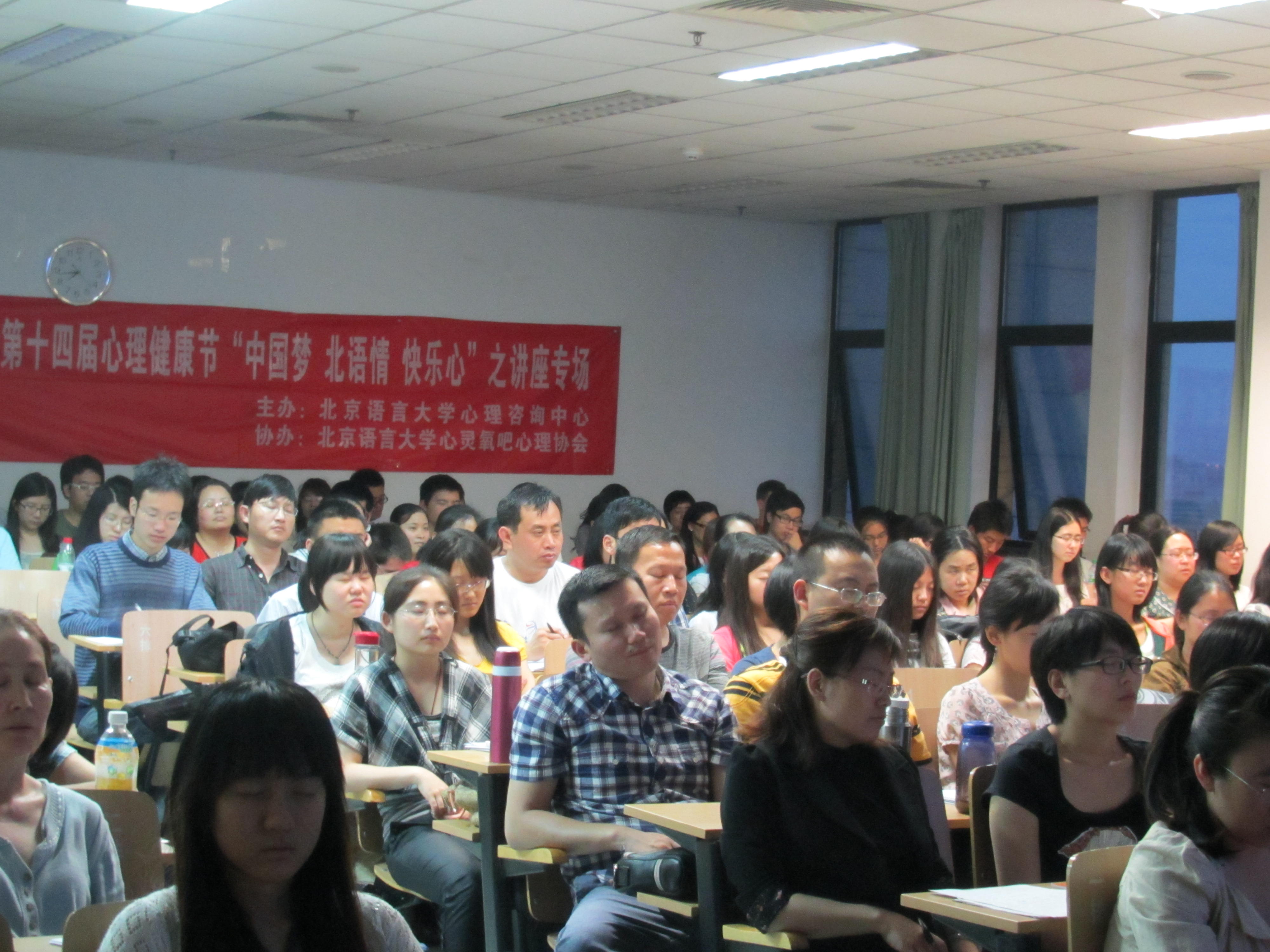 讲座中最独特的环节是“冥想”,这个环节是由Portnoy博士和心理咨询中心王颖老师分别用英文和中文完成的。在讲座结束后,我们采访同学的时候,同学们也表示了对于冥想这一环节印象深刻。闭上眼睛,一切都那么轻那么远。幸福也仿佛本就驻在心中一样。
